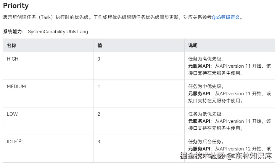 - Priority的IDLE优先级是用来标记需要在后台运行的耗时任务(例如数据同步、备份。),它的优先级别是最低的。这种优先级标记的任务只会在所有线程都空闲的情况下触发执行,并且只会占用一个线程来执行。