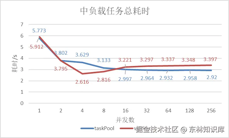 - 在并发任务数为1时,执行完任务TaskPool与Worker均相近;随着并发任务数的增多,TaskPool的完成任务的耗时大致上逐渐缩短,而Worker则先下降再升高。;