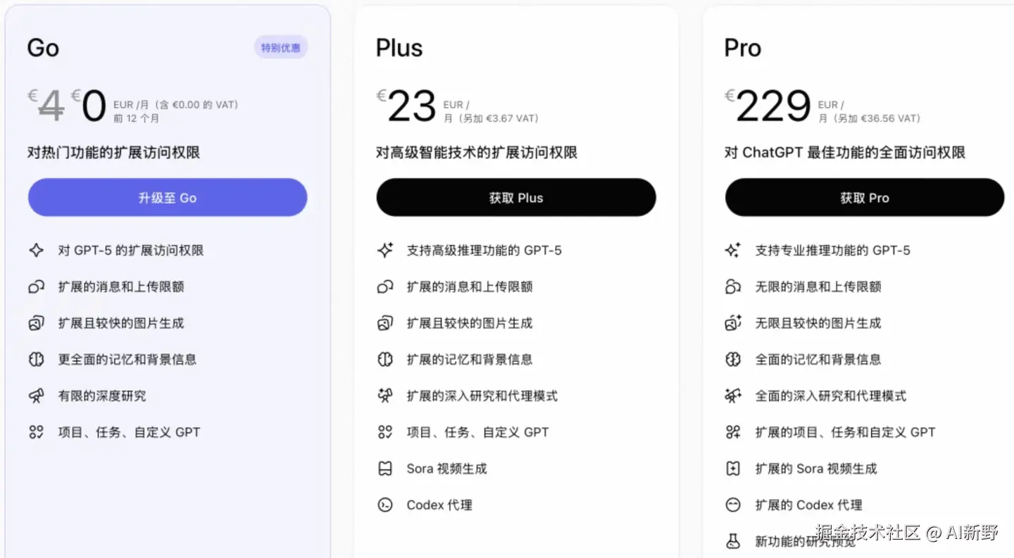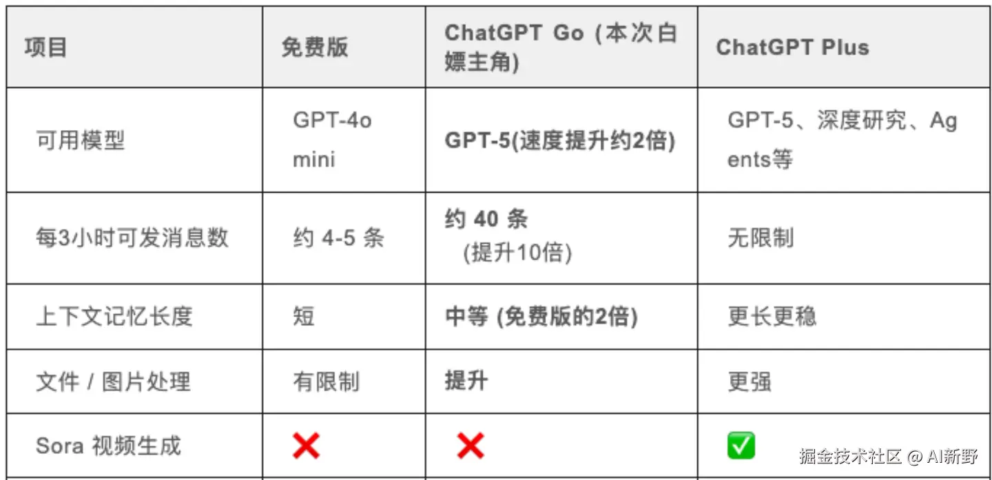 为了让大家更加直观的了解ChatGPT Go,我做一个一个对比图,大家可以参考一下。