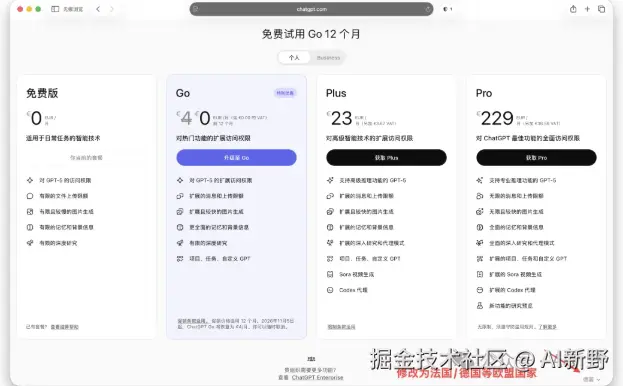 注册成功并登录后,你可以看到你的升级页面会出现ChatGPT Go会员,并且显示是0元