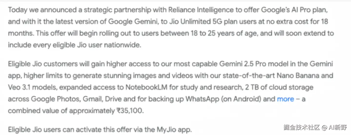 面向 Jio 用户推出 18 个月的 Google “AI Pro”免费计划,初期锁定 18–25 岁、开通指定 5G 套餐的用户,后续扩大覆盖。