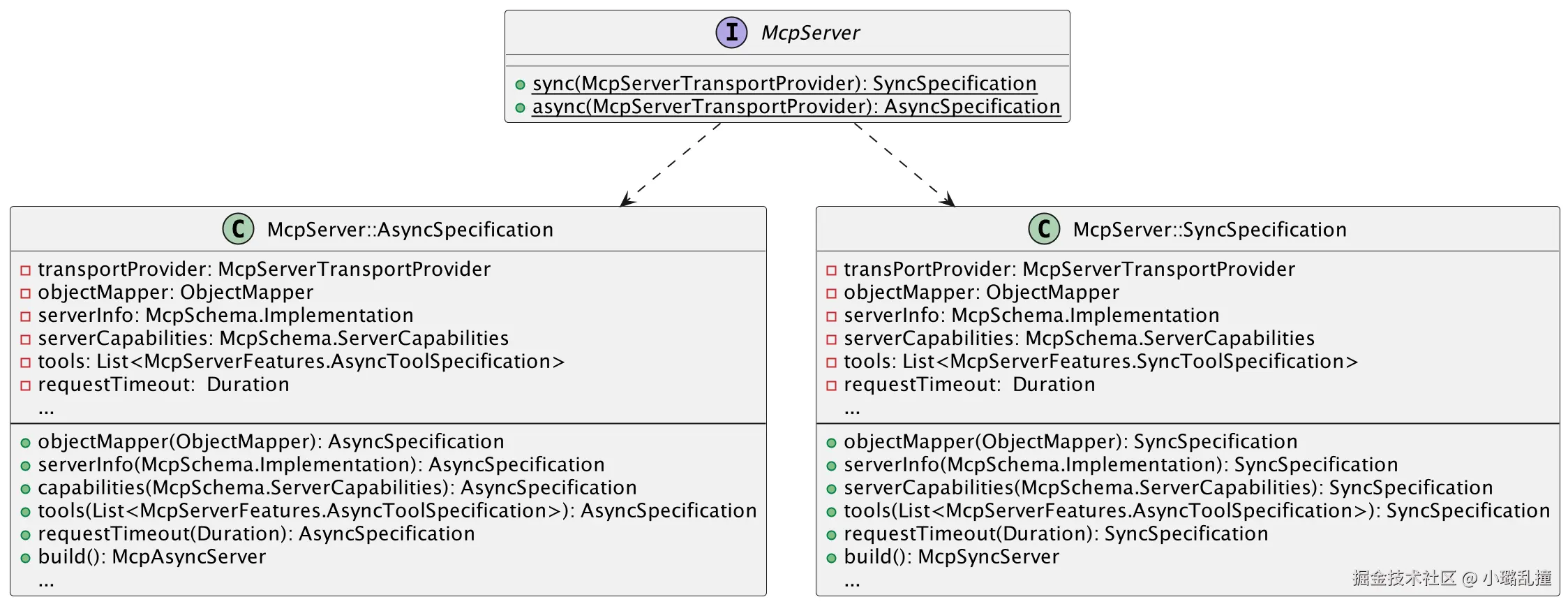 其中,AsyncSpec 和 SyncSpec 的设计非常相似,都封装了配置信息,且它们内部的方法(如 requestTimeout()、initializationTimeout()、capabilities())都只是对构建器内成员变量的简单赋值。而不同的是,异步模式在处理服务端的变更通知时,是基于 Reactor 的 Mono 进行响应式调用的,而同步模式则使用传统的 Consumer 回调方式。