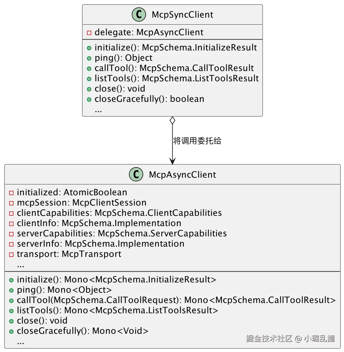 MCP 客户端运行层涉及到的类包括 McpSyncClient、McpAsyncClient,如下图所示: