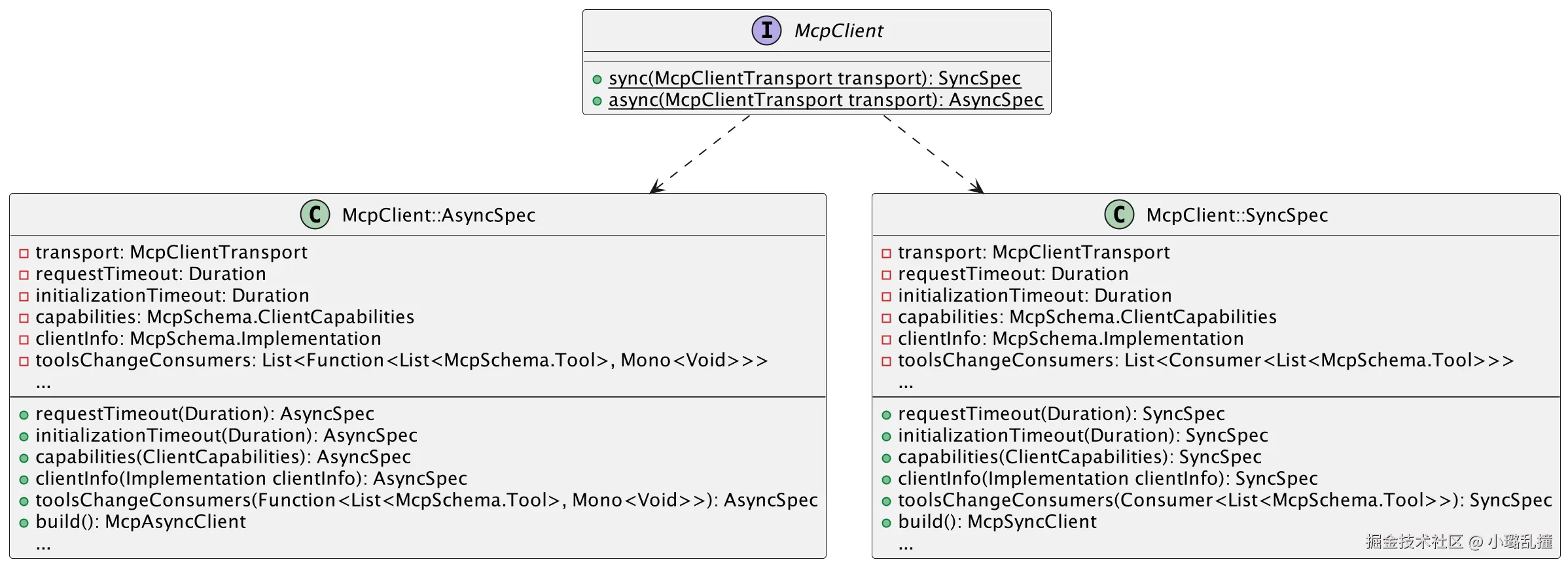 MCP 客户端入口层涉及到的类包括 McpClient、McpClient.AsyncSpc(内部类)、McpClient.SyncSpec(内部类),如下图所示: