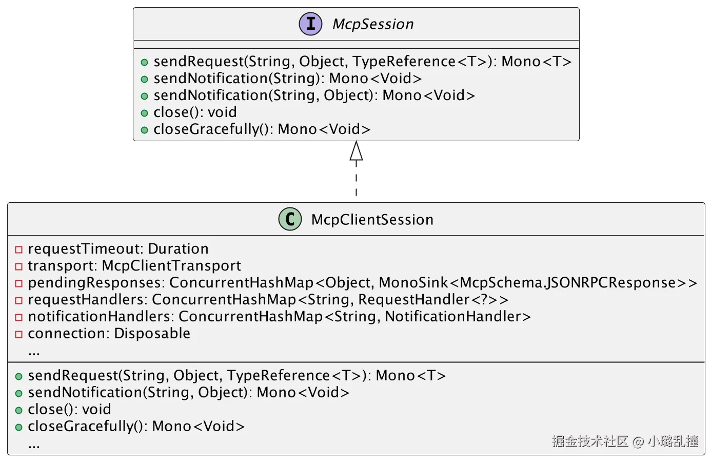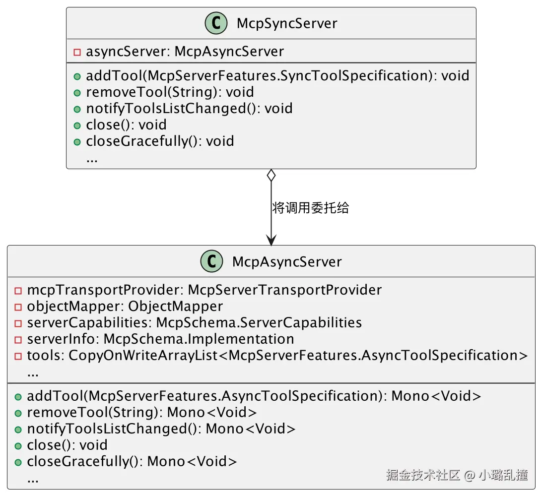 在运行层中,McpSyncClient 和 McpAsyncClient 分别是 MCP 同步客户端和异步客户端的执行核心,它们共同承担了与服务端交互的实际逻辑。从类图中可以看出,同步客户端并没有独立实现实际的业务逻辑,而是通过组合的方式持有一个异步客户端实例,并将所有核心方法调用委托给它执行。在其源码中,initialize()、ping()、callTool() 等方法都是通过调用异步客户端对应的方法,再通过阻塞的方式获取结果的。也就是说,同步客户端只是异步客户端的一层包装。
