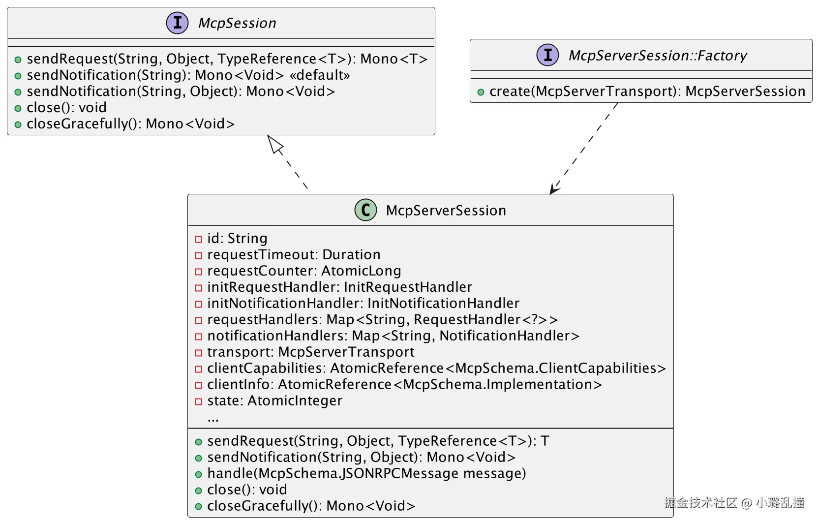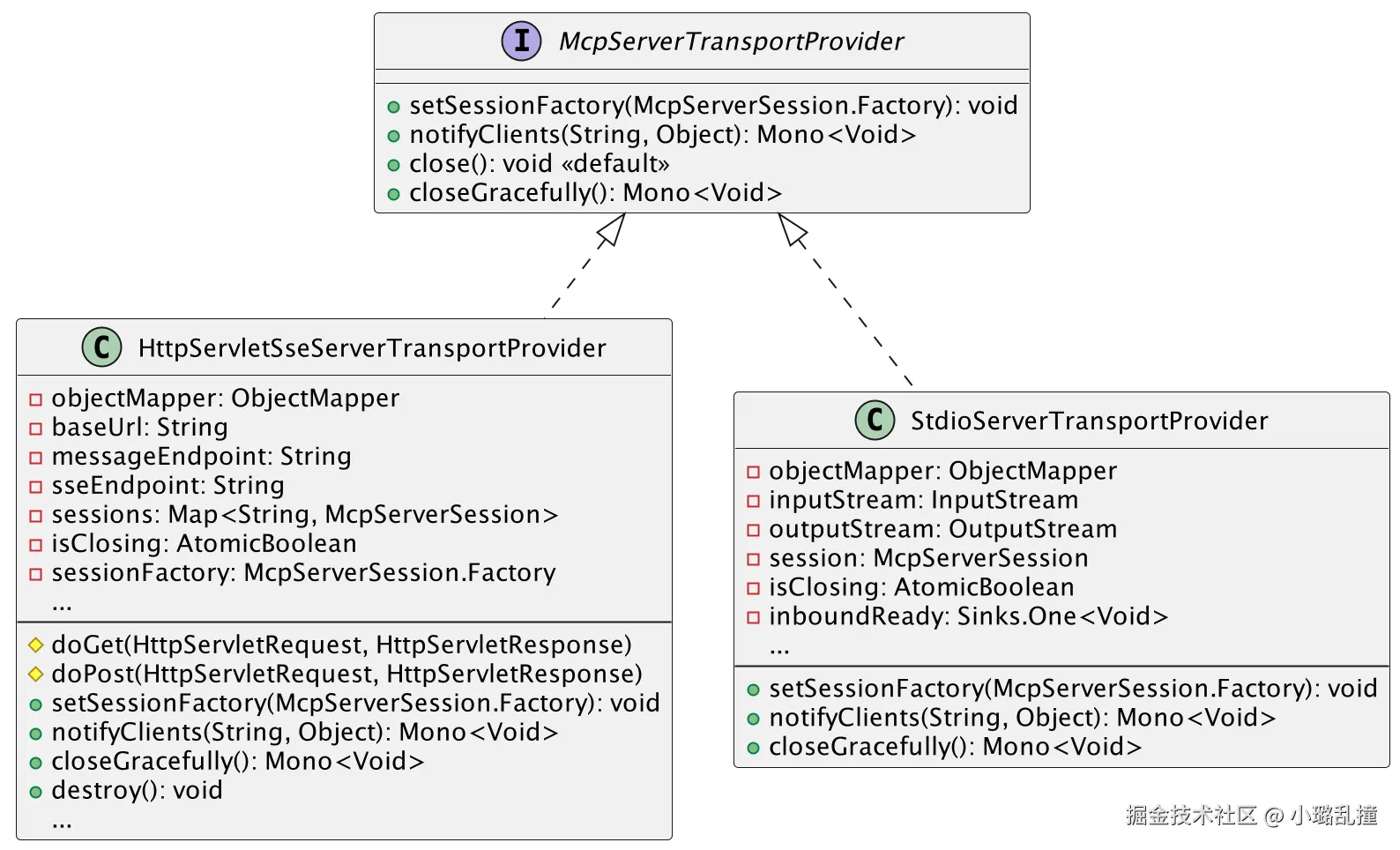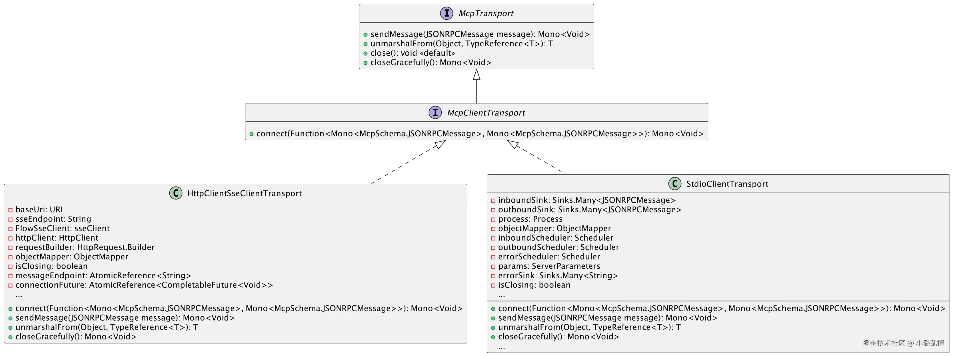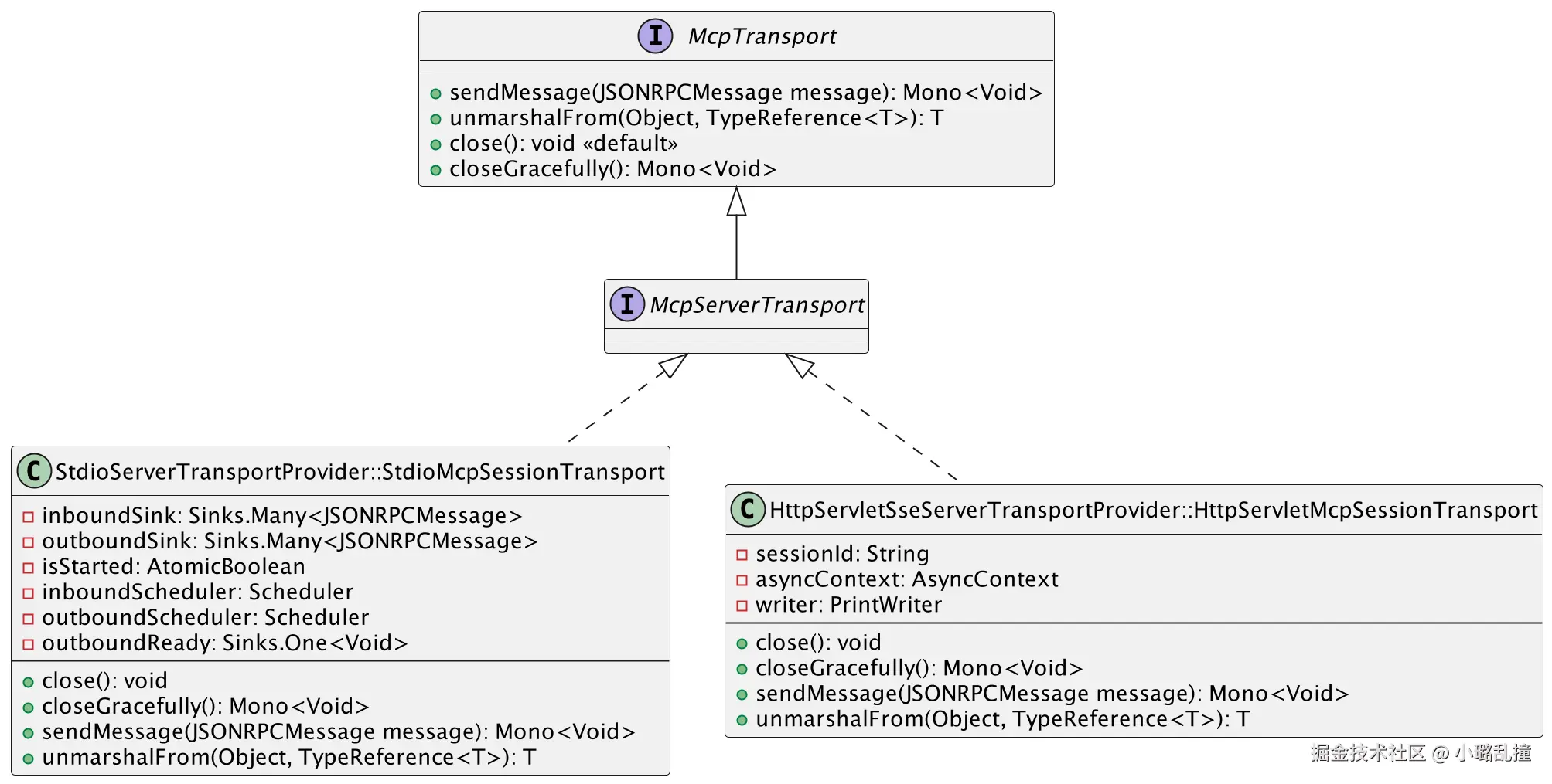 核心接口是 McpTransport 和其子接口 McpServerTransport,其中 McpServerTransport 内部为空,即服务端的传输层类还没有扩展其他的功能。McpTransport 中核心方法的功能已在 MCP 客户端传输层给出,这里不再赘述。