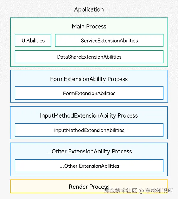 - 应用中(同一Bundle名称)的所有同一类型ExtensionAbility(除ServiceExtensionAbility和DataShareExtensionAbility外)均是运行在一个独立进程中,如下图中蓝色部分的“FormExtensionAbility Process”、“InputMethodExtensionAbility Process”、其他ExtensionAbility Process。