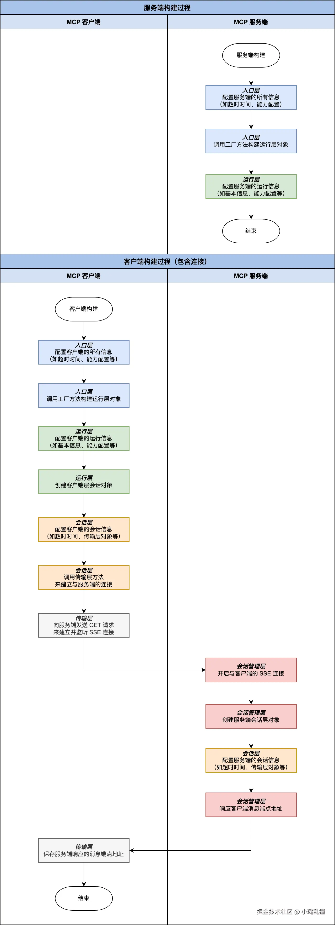 - 客户端构建过程:与服务端类似,在入口层中配置了客户端的所有信息(如超时时间、能力配置)后,调用其工厂方法就能构建出一个客户端运行层实例。但有所区别的是,客户端还需要创建出其会话层对象。在配置完会话层对象后(需要配置超时时间、传输层对象等),还需要调用传输层方法来建立与服务端的连接,此时会向客户端发送 GET 请求来建立并监听 SSE 连接。服务端的会话管理层接收到后,会开启 SSE 连接,并为客户端创建一个会话层对象,最后再返回客户端消息端点地址(之后客户端需要向这个地址发送业务交互消息)。在客户端收到响应后,会保存这个消息端点地址,至此客户端的构建过程才算结束。