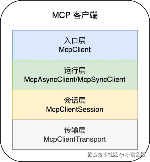 - 入口层:这一层是 MCP 客户端/服务端对外的统一入口,对应的接口为 McpClient/McpServer。只需通过其工厂方法,并提供配置信息(如超时时间、能力配置等),就能以同步或异步模式创建运行层的客户端/服务端实例。入口层对下层的复杂实现进行了封装,对上层提供统一、简洁的构建入口,使得调用者无需关心传输方式与消息机制的差异。