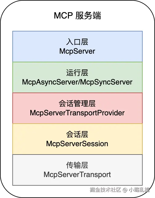 - 会话管理层:这一层是 MCP 服务端特有的部分,用于管理多个客户端会话,对应的接口为 McpServerTransportProvider。其用于管理活跃会话的生命周期、向所有客户端广播消息、统一关闭与清理连接资源等,使得服务端可以同时维护多个客户端连接。