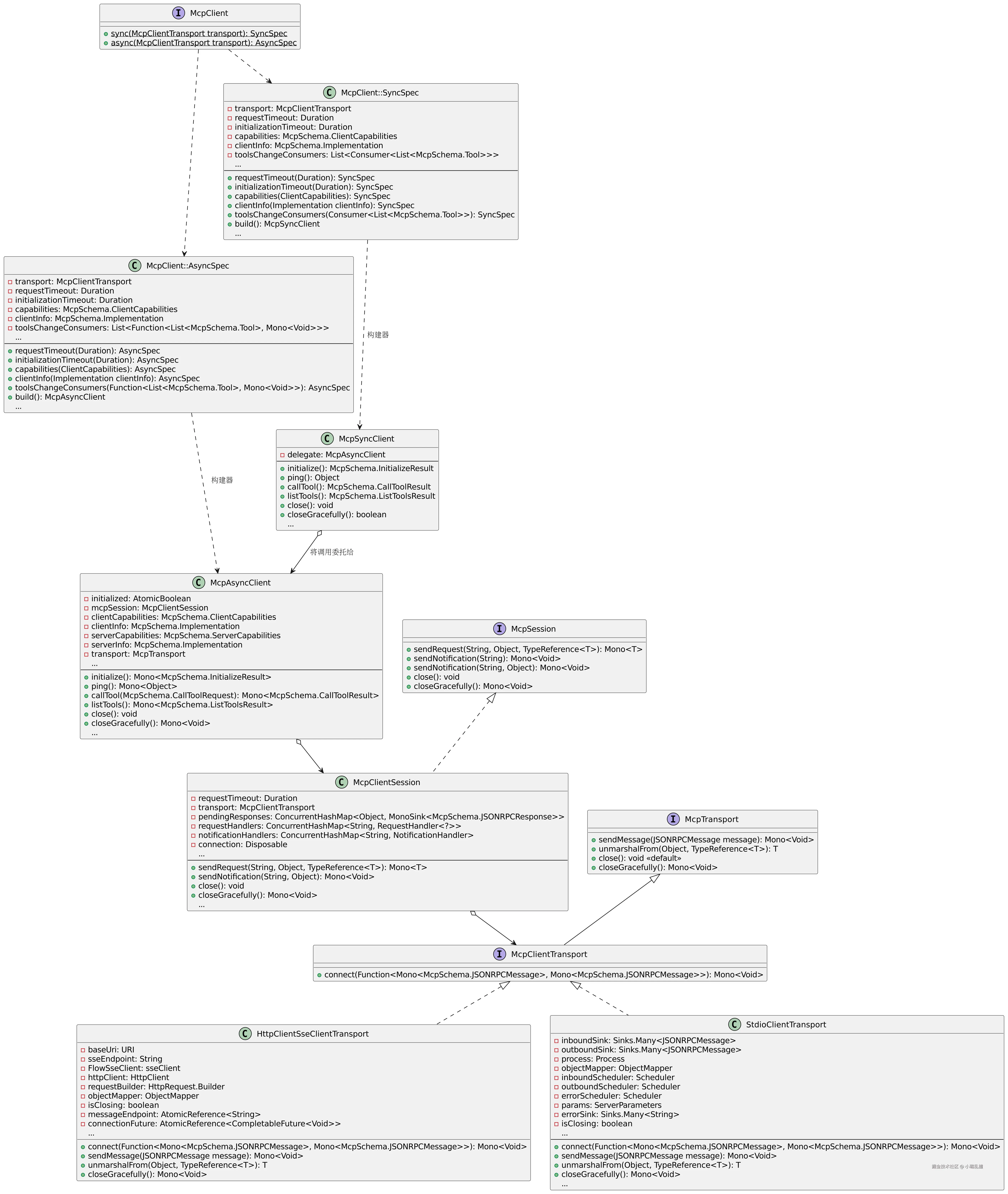 在上一章中,我们深入解析了 MCP 客户端与服务端在 SSE 模式下的核心交互流程,从构建与连接、初始化,到工具的发现与调用,全流程呈现了分层架构下各模块的协作机制。理解了交互逻辑之后,本章将以 Spring AI MCP 的源码为基础,剖析其核心组件的实现细节,以更好地理解其内部的运作方式。