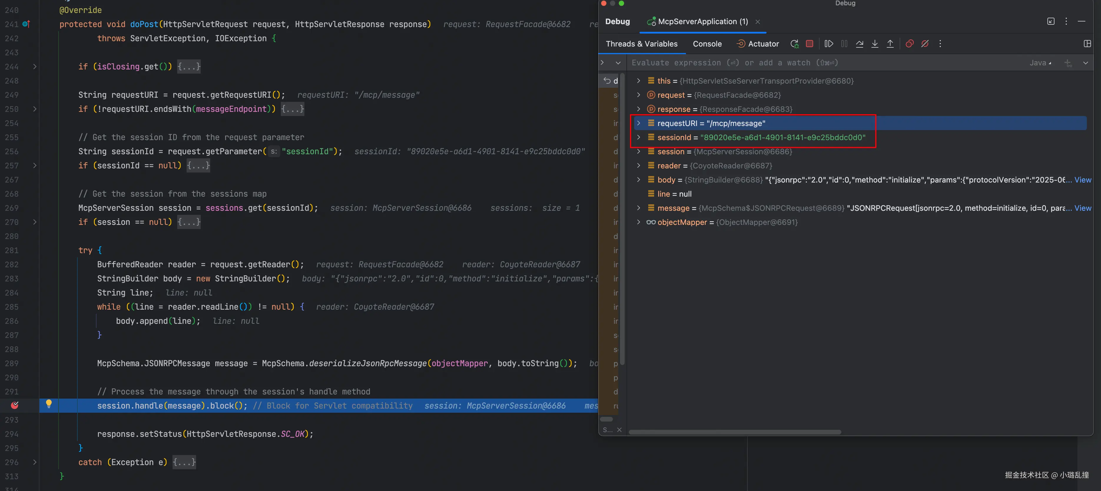 在第三章讲解初始化过程时,提到初始化过程包含两大步骤:初始化建立、初始化完成通知,而对于这两个步骤,客户端都会发送 POST 请求,因此这里首先需要把断点设置在服务端会话管理层 HttpServletSseServerTransportProvider 中接收 POST 请求的方法 doPost()。在 MCP Inspector 中触发这一步骤的方式就是点击 Connect 按钮,在连接完成后,就会发送 POST 请求触发初始化过程。