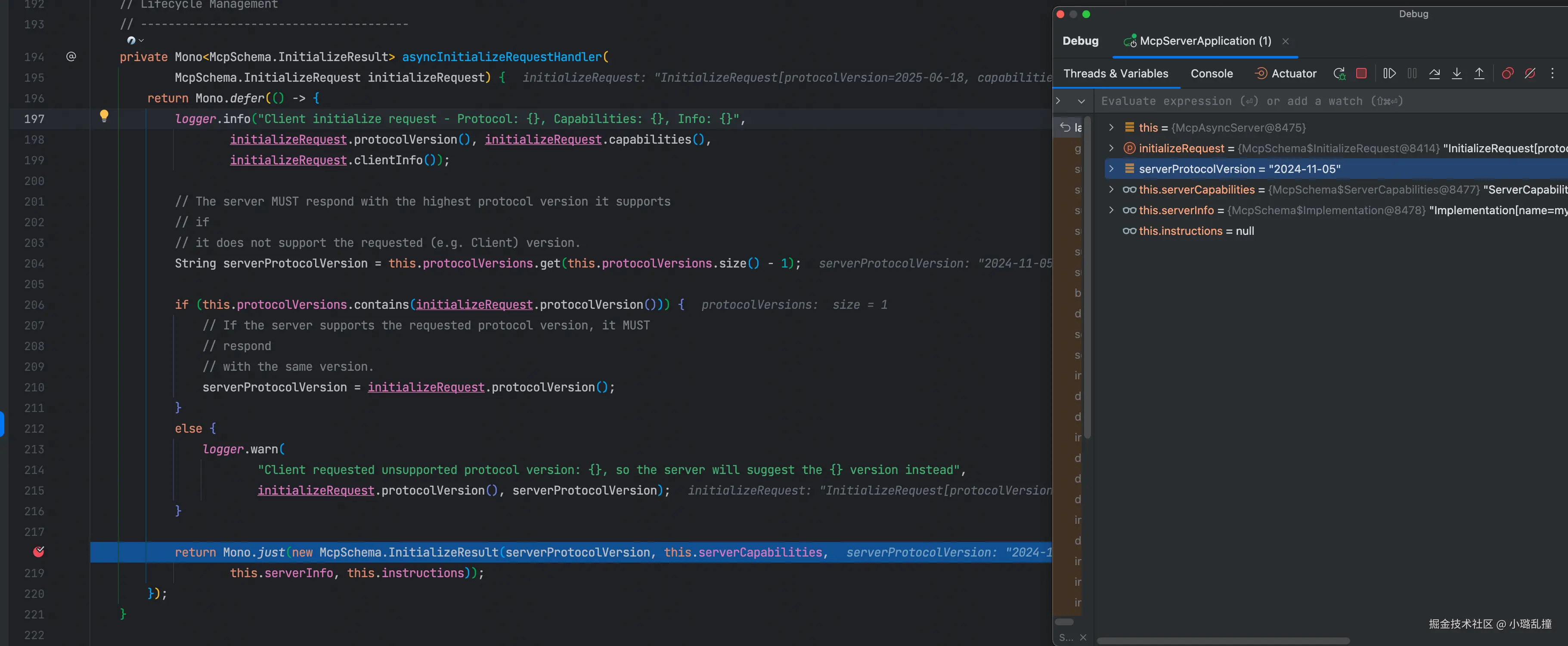 处理器的实现对应于 asyncInitializeRequestHandler() 方法(这个方法的定义在运行层 McpAsyncServer 中,以 lambda 的方式传给了会话对象),这个方法会构建给客户端的返回结果,即服务端的基本信息、协议版本等。如下所示。