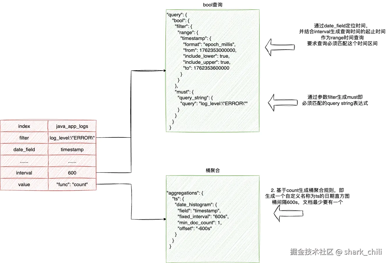 cate:指明数据源类型为elasticsearchdatasource_id:规则配置使用的数据源为id为1,也就是我们首次配置的elasticsearch数据源query:这个json块比较重要,它说明我们配置的规则名为A,索引类型index_type为索引类型而非索引匹配模式,然后index指明为java_app_logs,然后就是kql配置规则和提取方式为countdate_field:指明采集的时间字段用索引中的timestamp