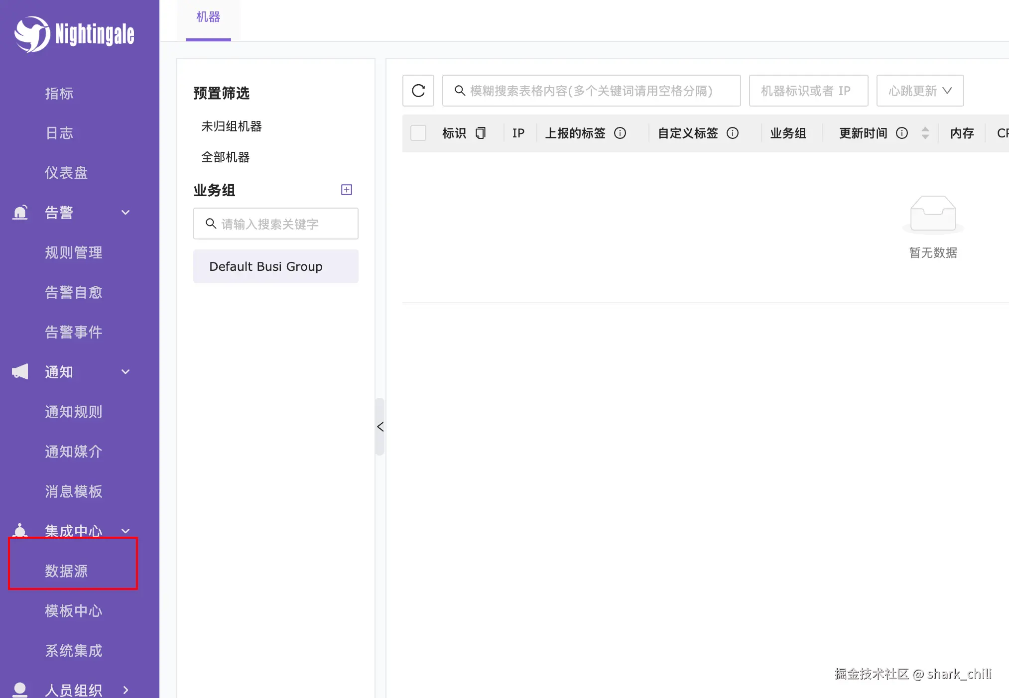 登录管理界面之后,就可以将es数据源引入进行监控告警管理了,通过集成中心定位到数据源,点击进入数据源配置界面: