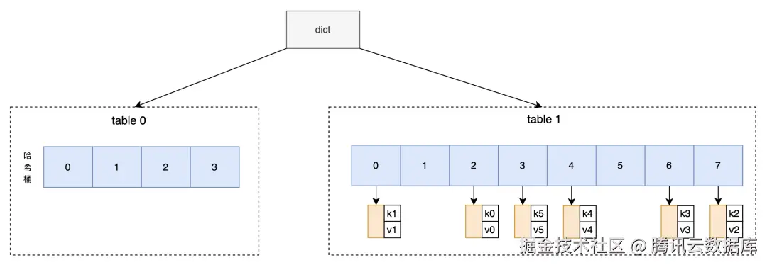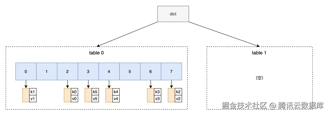 (4)rehash完成后释放table0,把释放后的table0和拥有完整数据的table1交换一下(可以理解为交换名字),扩容完成。扩容完成后的dict如图六所示。