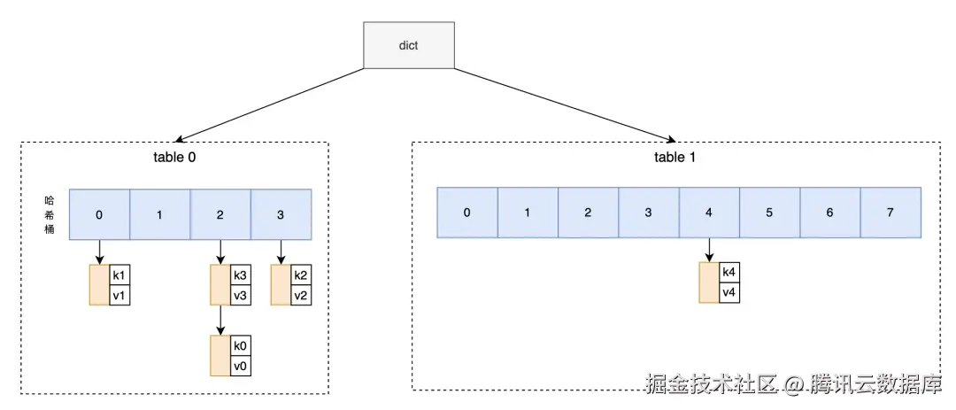 (2)用户写入新的元素k4-v4,导致负载因子大于1,扩容触发。dict在table1中创建新表,分配8个哈希桶,新到来的k4-v4直接写到table1中。如图四所示。