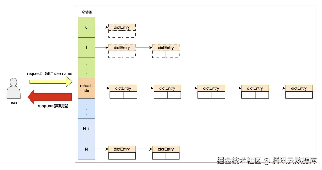 这种"顺便"的代价可不小。被动rehash虽然将迁移成本分摊到每个用户请求中,但也意味着用户的每一次读写请求都会被强行增加一个额外的rehash步骤。在高QPS下,这会显著拉低系统整体的吞吐量和性能表现。正如在文章开头提到的线上事故中,Redis分片的平均时延翻倍,这其中就离不开被动rehash的“贡献”。