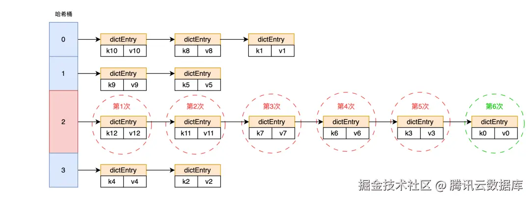 不难想到,这样的读取方式会带来下述问题:如果哈希桶中的key-value对太多,并且我们要查询的key非常不幸地位于链表尾部,那么我们就不得不遍历链表的所有节点才能读取到目标value,本次查询就会偏慢。如图二所示,如果用户执行“GET k0”命令,那么它需要进行6次比较才能完成查询。可以想象,如果哈希表永远只有4个桶,元素个数为N,那么每个桶的平均key-value对数量为N/4,每次查询平均需要做N/8次比较。在数据量N很大时,这样的查询性能是无法接受的。如何解决以上问题呢?很简单,给哈希表分配更多的哈希桶就行了。