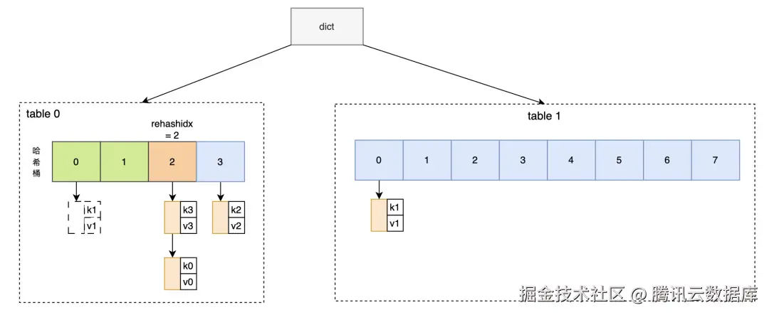 这里做一些补充说明:Redisrehash的最小单位是一个哈希桶,一次rehash至少会把一个哈希桶里的所有元素全部搬到新表。Redis的dict维护了一个索引计数器变量rehashidx,用于记录渐进式rehash进行到了哪个位置,或者说rehashidx就是下一个要被迁移的桶的桶号。rehashidx从0开始,每次搬完一个桶后就加1。如图七所示,table0中的0号桶最先被迁移;1号桶是空桶,被跳过;目前rehash进行到了2号桶,在下一次迁移时,2号桶中的两个元素都会被迁移。