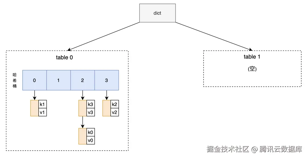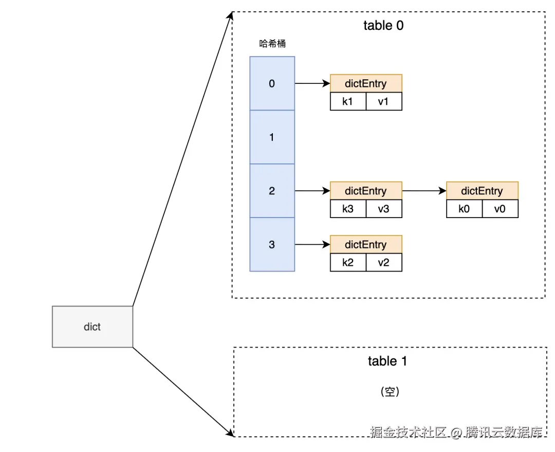 Redis的渐进式rehash就是遵循这样的思路。table 1分配出来后,同时使用table 0和table 1两个哈希表。新写入的数据直接写入table 1,查询数据则会先查询table 0,再查询table 1。在此期间将元素渐进式地从table 0转移到table 1,转移完毕后释放掉空的table 0,然后将table 1设置为新的table 0。