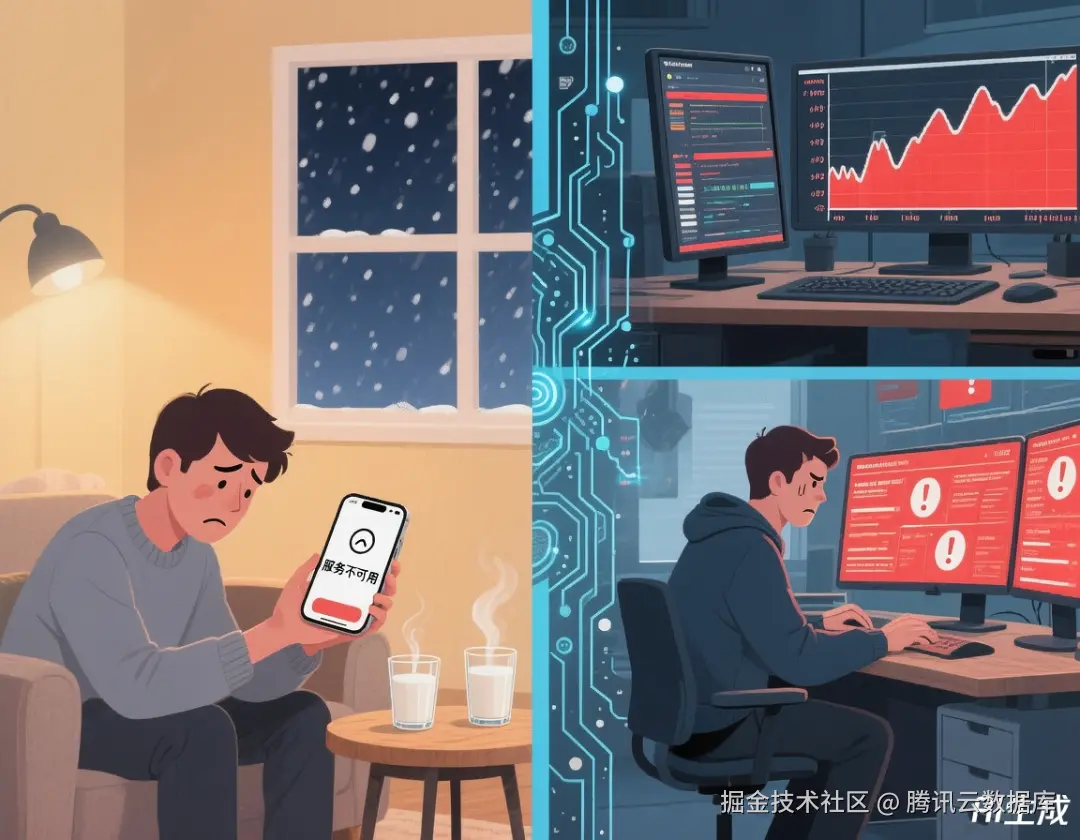 这是一个寒冷的冬夜,你拖着疲惫的身躯回到家中,盛满一杯热牛奶,躺在松软的沙发上。“终于到周末啦!”,你一边庆祝着,一边郑重地打开了你最爱的娱乐软件,准备狠狠happy一波。但天有不测风云,平时能轻松登录的应用软件,今天竟然显示“登录失败”。你以为是网络问题,于是熟练地刷新页面、切换网络,但那个刺眼的提示依旧顽固地占据着屏幕,直到各种方法用尽,却依然无法登录后,你恍然大悟——应用服务崩了!