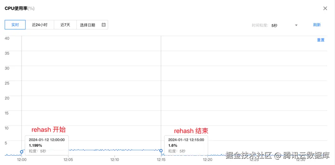 从实例监控图像中可以看到,触发 rehash 后,CPU 资源平均只会消耗 2% 左右。约3300W 个key搬迁耗时是 15 分钟,平均 1 分钟可以 rehash 搬迁约220W 个key。