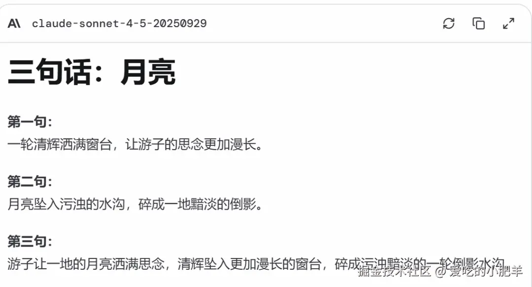 Claude描述中提到月光(清辉)以及月光带来的情感(游子思念)。它没有给你看月亮,而是让你感受到了月亮的存在,给人一种故事感。
