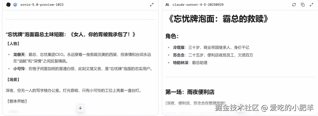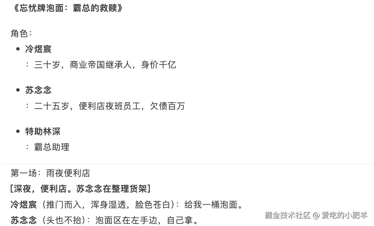 更重要的是,它的剧本细节也远胜一筹:从更细致的人物介绍,到台词中大量关于动作和表情的描写,这些都是Claude版本所欠缺的。