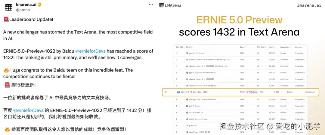 百度的全新模型ERNIE-5.0-Preview-1022,在文本榜单,直接冲到了全球并列第二、国内第一的位置!