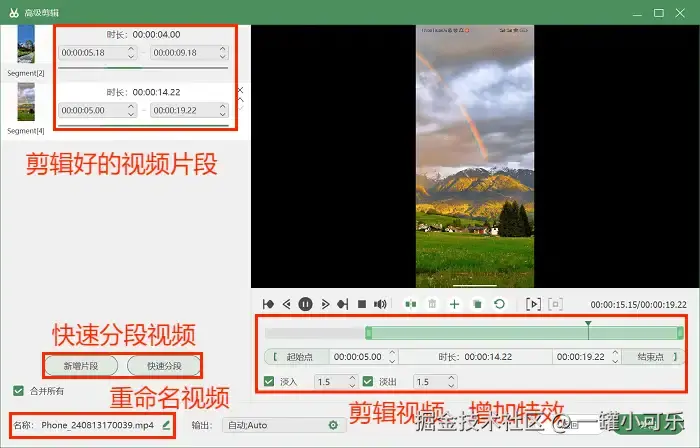 步骤3:录制完毕后,可以利用软件的视频编辑功能,对视频进行快速分段、添加视频特效、重命名视频等操作。