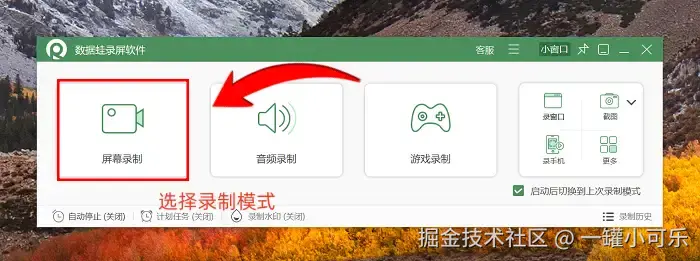 步骤1:启动数据 蛙录屏软件,进入主界面后选择适配自身使用场景的录制模式。就常规需求而言, “屏幕录制” 模式是比较常用的选择。