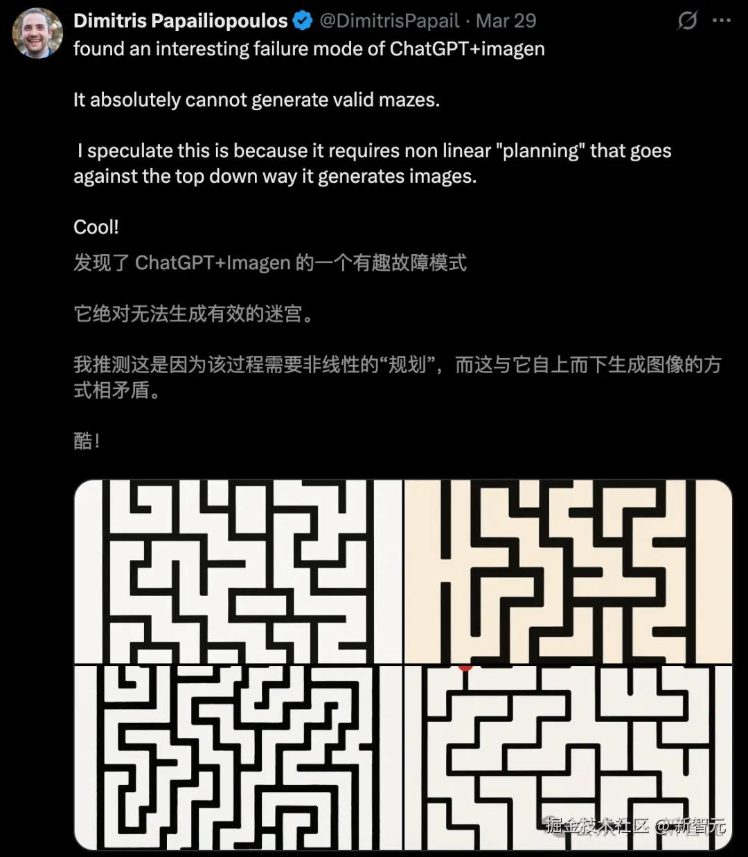 在估算距离、方向和尺寸,或通过从新角度生成图像来进行物体的「心理旋转」等任务上,最先进的 MLLM 模型的表现鲜有超过随机猜测的。它们无法走出迷宫、识别捷径或预测基本的物理现象。AI 生成的视频——尽管初露锋芒,且的确酷炫——通常在几秒钟后便会失去连贯性。