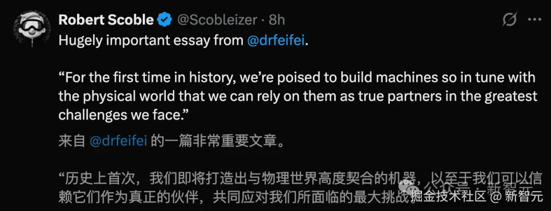 李飞飞表示,「我不是哲学家,但我深知,至少对 AI 而言,世界远不止于文字」。