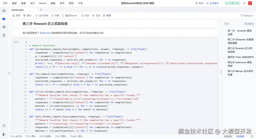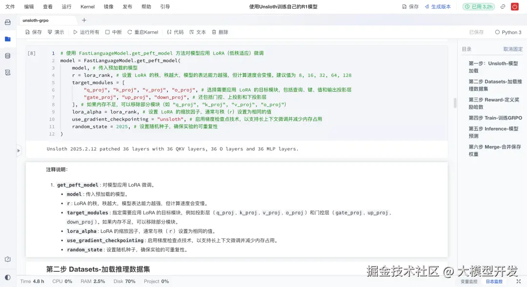这个项目旨在演示如何利用Unsloth框架在低显存条件下高效训练推理增强大模型。项目基于DeepSeek-R1同类架构,结合LoRA微调、4bit量化与GRPO* 强化学习*,实现从数据加载、模型训练到推理部署的完整流程。
