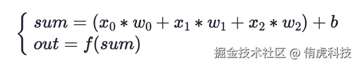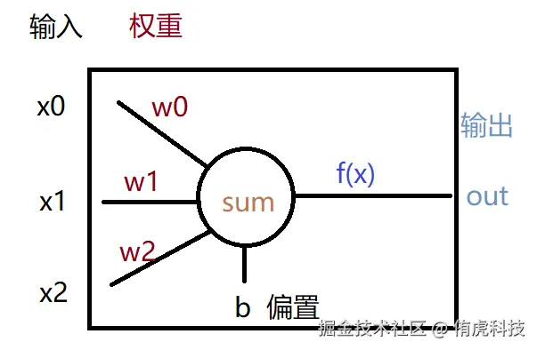 将传入感知机的多个输入x,与对应的权重w相乘(输入的数量与权重的数量是一样的,且数量是任意的,本例中用了3个),再加上偏置b就可以得出一个计算值sum。再将这个计算值传入一个函数f(x)就可得到感知机的最终输出out。