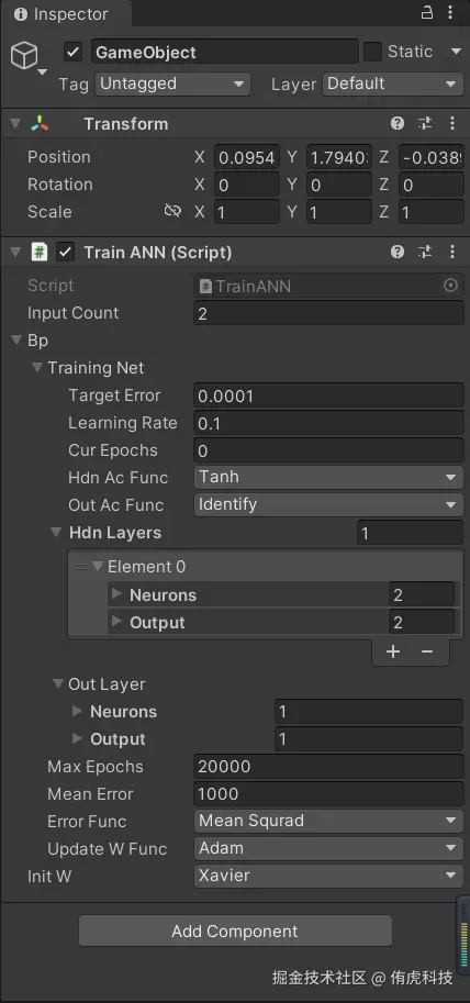 我们再完善下脚本,设置好训练输入和输出(以「异或」运算为例),使得神经网络能在Unity运行时逐帧训练: