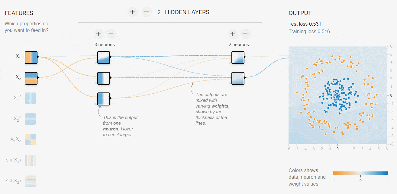 我们会给出一些输入以及该输入所对应的正确输出,比如我们可以记录小明上个学期玩网游时的各因素值以及不玩时的各因素值,这些作为**「训练集」。然后设计一个「损失函数」评判当前神经网络的输出与正确输出之间的差距。而程序就是不断地调节各个权重,使差距越来越小,这种调节的根据是「导数」,但在这里我就不展开了。总之,如果训练得当,神经网络的损失就会越来越小,直到停在一个值附近,这就是「收敛」**。