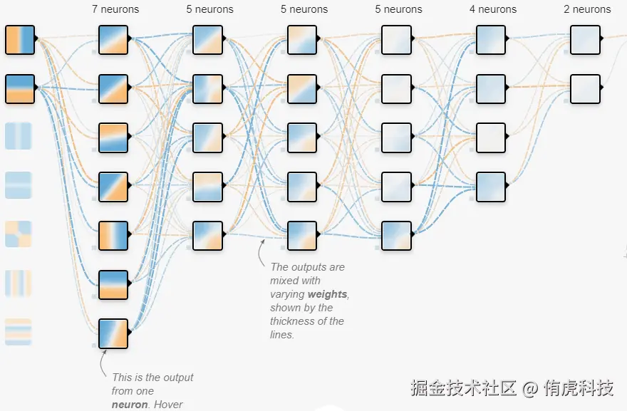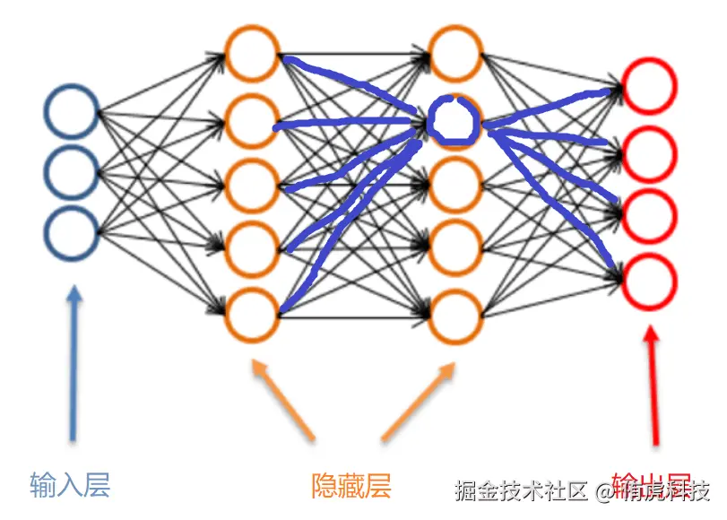 但这里的单个感知机(后面用「神经元」来代称)怎么输出了多个值(看标蓝色的那部分)?这种结构图可能会误导某些人,我做个解释,这里的每一条线并不是输出,可以看到它是有箭头的,每条线表示它所指向的那个神经元的一个权重。加上箭头是为了表示数据传递的方向。