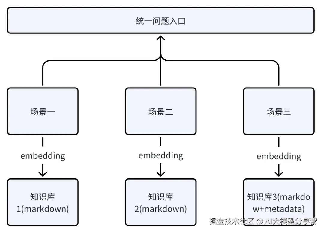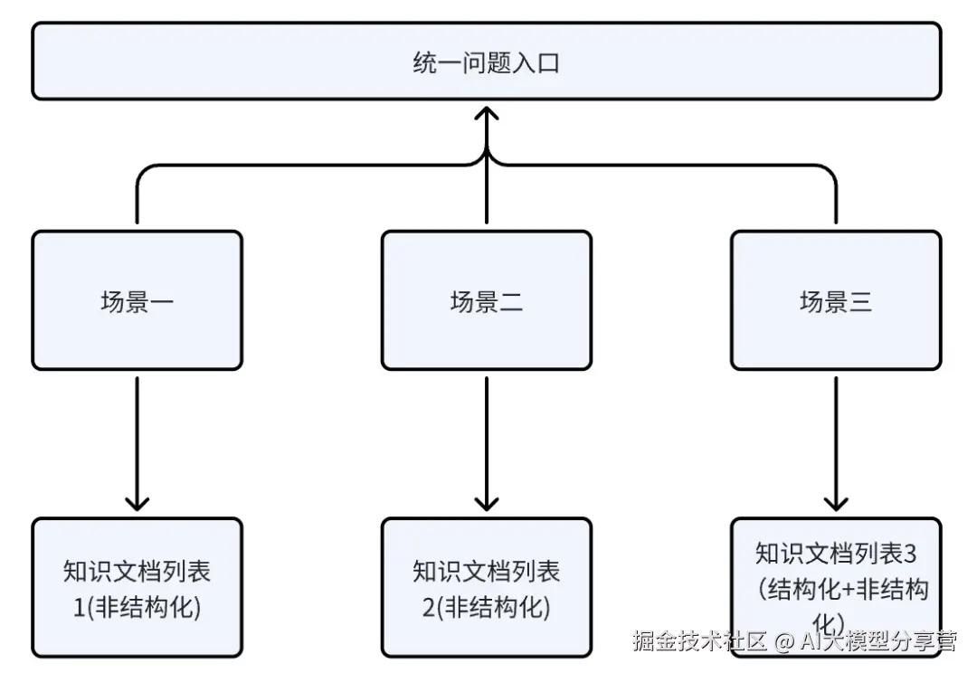 作者手里的这个项目是一个智能问答场景,但根据业务类型又区分为三个不同的子场景,并分别对应三种不同的知识问答。业务需求上要求这三个子场景使用同一个入口,并最好能不需要人工区分场景(如三个子菜单或下拉框),能够让系统根据问题智能判断不同的场景并选择不同的文档。