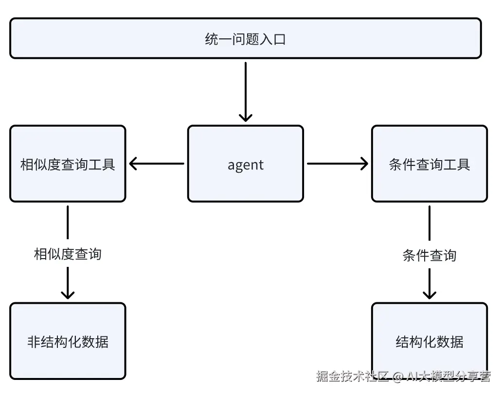 这样业务逻辑就简单多了,而且实现智能体时也简单多了;只需要实现两个工具即可,一个是条件查询工具,另一个是相似度查询工具;简单来说就是两个知识库各实现一个查询工具即可。