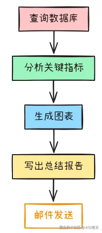 1.查询数据库 → 2. 分析关键指标 → 3. 生成图表 → 4. 写出总结报告 → 5. 邮件发送。