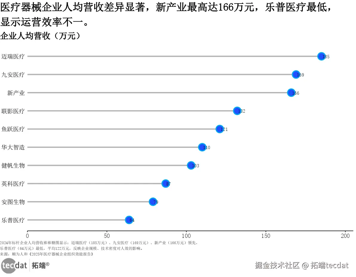 2024年标杆企业的人均营收平均122万元,但差距特别大:迈瑞医疗185万元、九安医疗169万元、新产业166万元,而乐普医疗只有64万元。为什么差这么多?一是规模效应,迈瑞在全球有10多个生产基地,单位成本比中小企低20%;二是产品结构,高附加值设备占比高的企业,人效自然高。