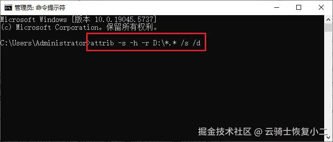 如果以上两种图形界面的方法都无效,或者你怀疑是病毒修改了注册表导致设置失效,对于“D盘文件隐藏后如何恢复”的问题可以尝试使用命令行的方式解决。