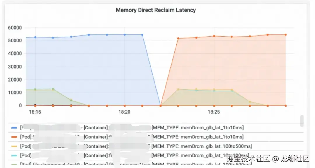 后面我们接手问题后,通过 Alibaba Cloud Linux 自研指标(该指标反映容器由于内存回收阻塞的时长)发现,存在非常高的内存回收延时,且时间节点和抖动时间匹配: