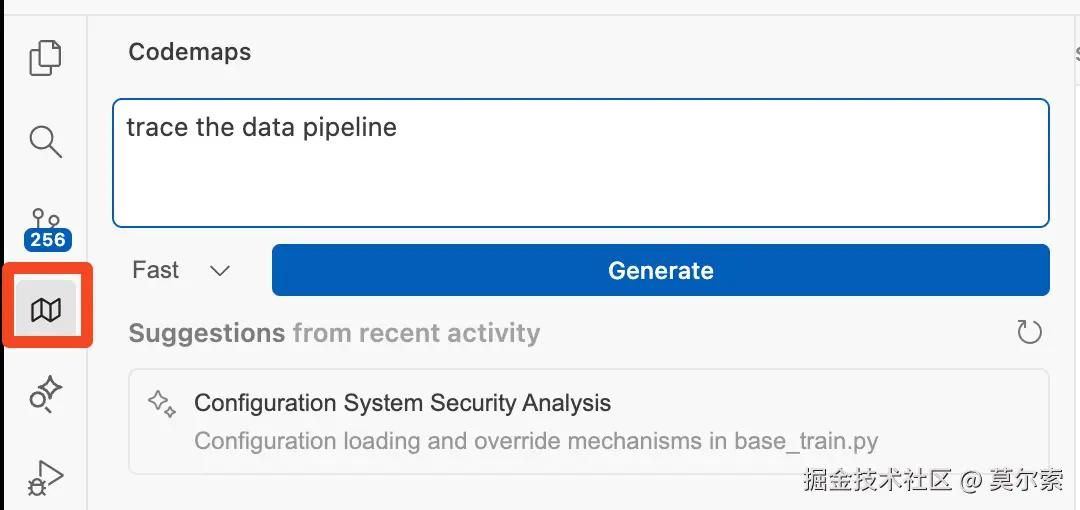 Codemaps 的核心是为任何特定问题提供即时映射(Just-in-Time mapping) 。当你在 Windsurf 中打开一个代码库,并通过新图标或快捷键(Cmd+Shift+C)首次打开 Codemaps 时,你可以输入一个关于你正试图执行的任务的提示(prompt),或者采纳自动建议。你可以选择 Fast (SWE-1.5) 或 Smart (Sonnet 4.5) 模型来生成你的 Codemap。