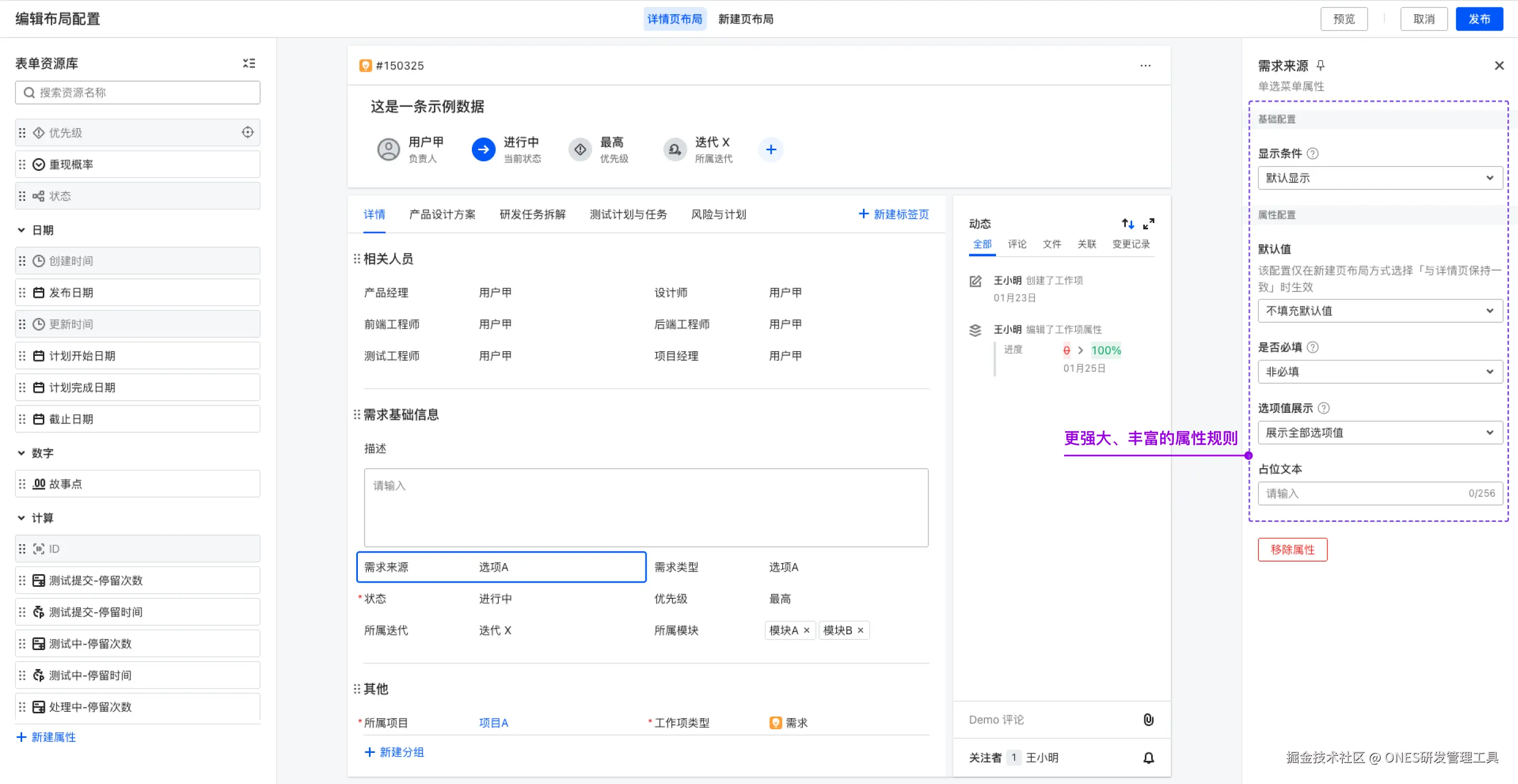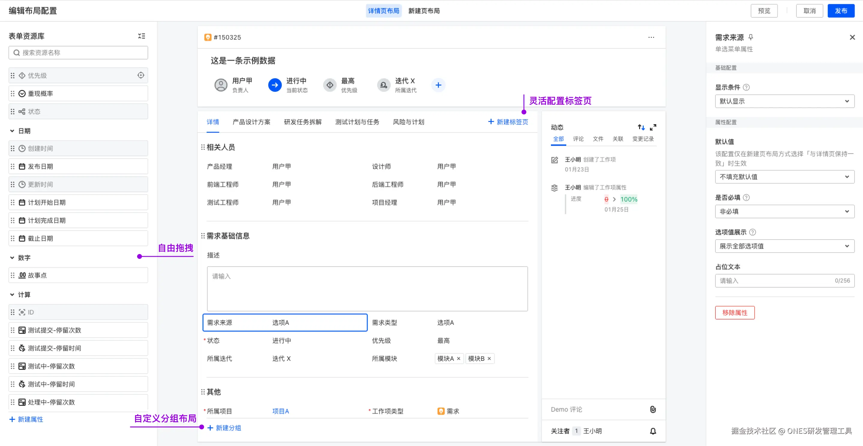 通过灵活配置工作项标签页、自定义属性的布局和分组,不同部门成员(如产品、研发、测试)可以查看与自身相关的属性,避免信息冗余,提高表单使用效率。