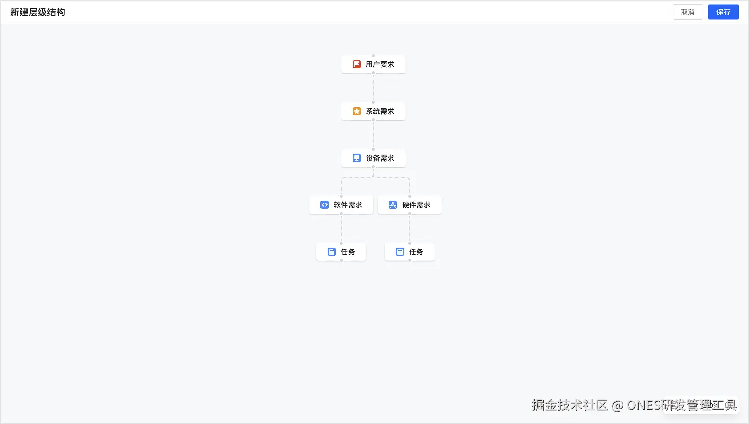 由于行业和管理方法各不相同,不同企业在需求分层模型上也存在显著差异。ONES Project 层级结构功能支持企业根据自身业务流程,灵活定义并搭建工作项类型之间的层级结构,还原企业的需求分层模型。