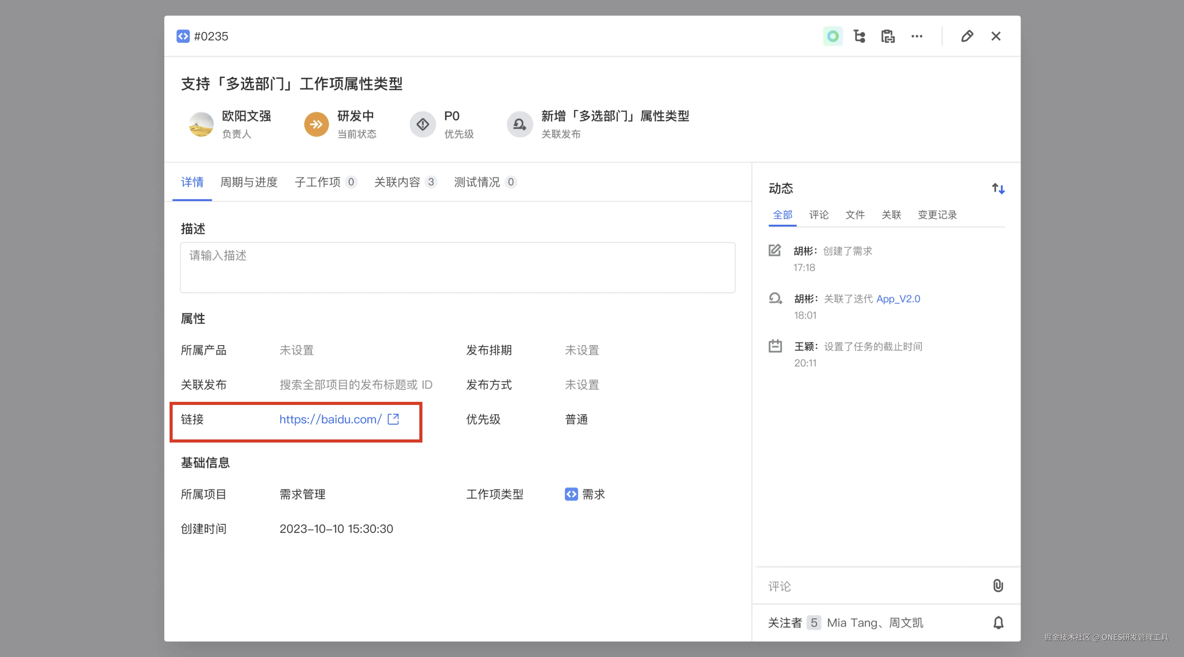 链接属性支持在工作项中直接配置外部链接,实现一键跳转访问,让协作路径更短,上下文切换更顺畅。