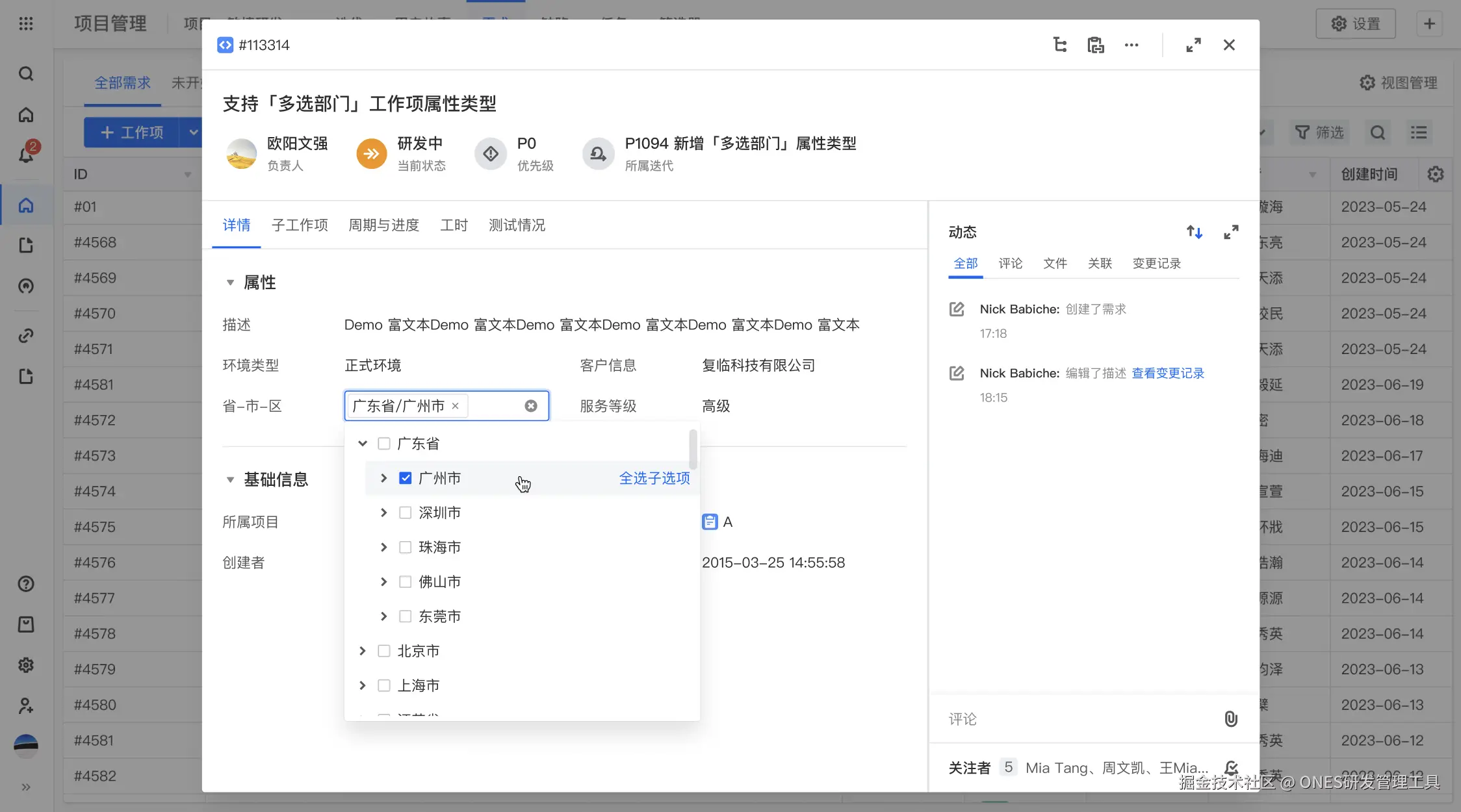 ONES Project 对工作项属性进行升级,支持将原「关联内容」进行属性化配置;同时,新增级联、公式计算、富文本、标签、链接等多种属性类型;还将富文本编辑器升级为 ONES Wiki 编辑器,提供更丰富的编辑能力,实现更精准的信息管理和更充分的业务表达。